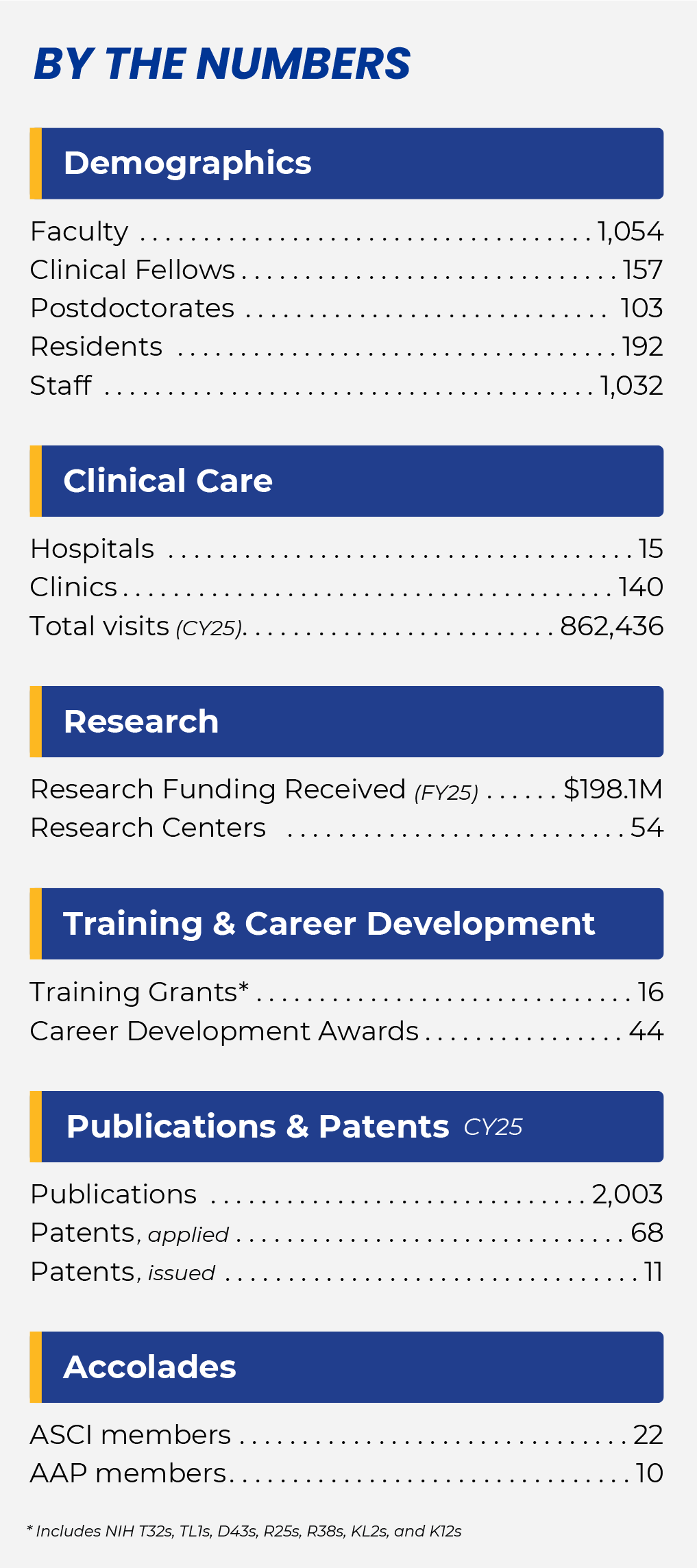With support from its 9 T32/TL1 training grants and other internal/external funding mechanisms, the Department of Medicine supports the research training of 103 postdoctoral fellows. The Department of Medicine is also dedicated to assisting trainees with their transition to independence, as evidenced by the over 40 junior faculty within the Department of Medicine who currently hold career development awards from federal and foundation sources.